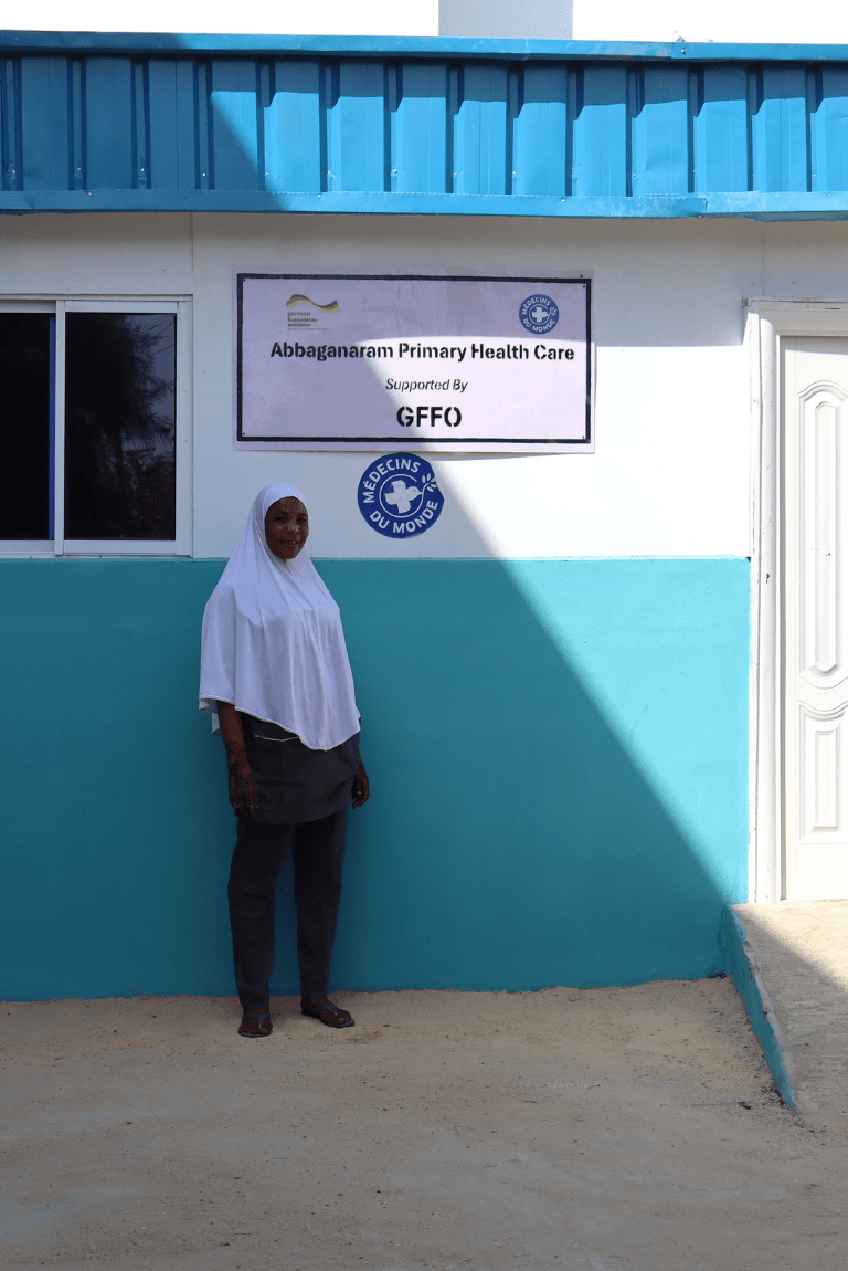 Aisha in front of Abbaganaram’s nutrition department facility