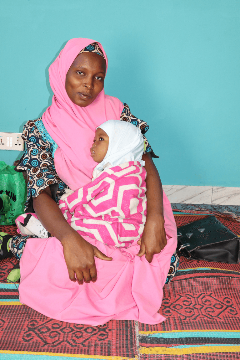Maryam holding her daughter at Abbaganaram's nutrition department