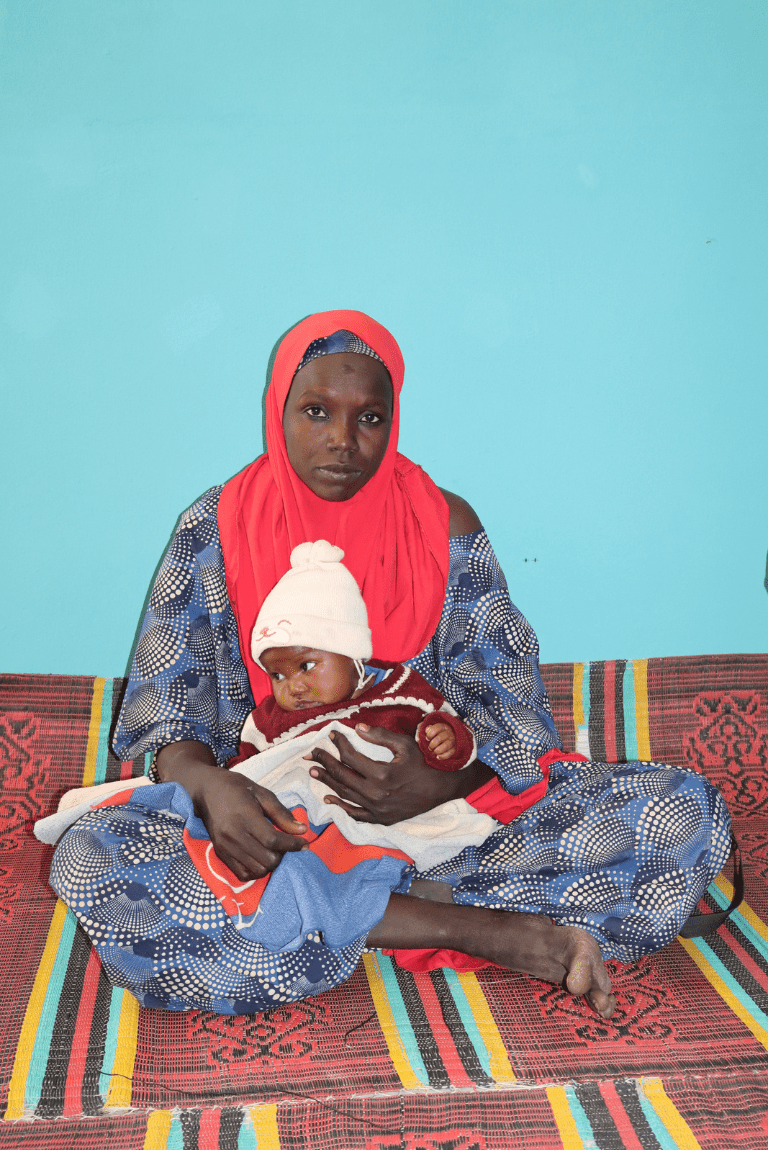 Fatou holding her son at Abbaganaram’s nutrition department