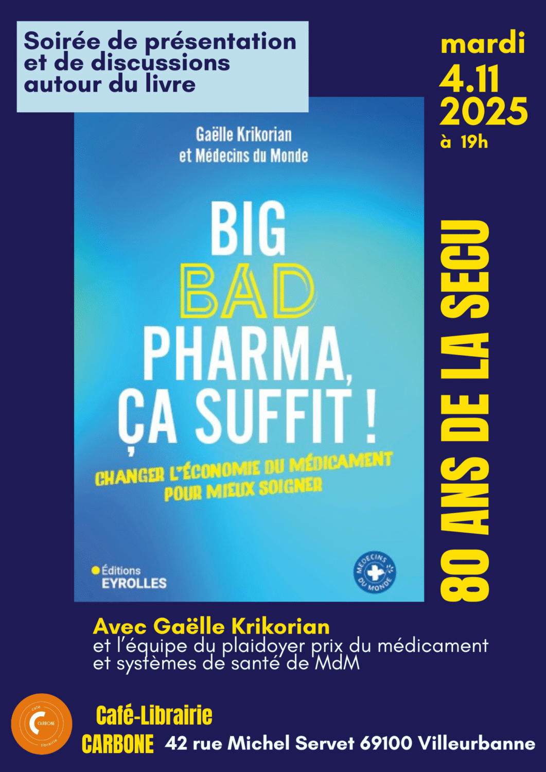 Venez rencontrer Gaëlle Krikorian et l’équipe du plaidoyer prix du médicament et systèmes de santé de Médecins du Monde au café-librairie Carbone de Villeurbanne le mardi 4 novembre 2025 à 19h.
